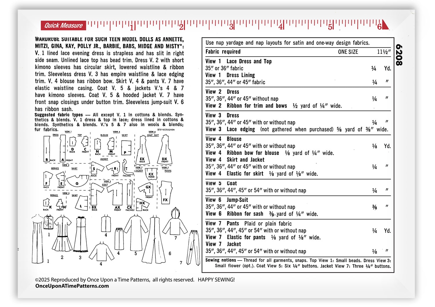 With its range of dresses, coats, jackets, skirts, pants, and accessories, Simplicity 6208 provides endless options for sewing stylish vintage-inspired clothing for Barbie and similar teen model dolls. Perfect for collectors, sewing enthusiasts, and anyone who loves creating timeless doll fashions, this pattern captures the charm and elegance of mid-century doll wardrobes.