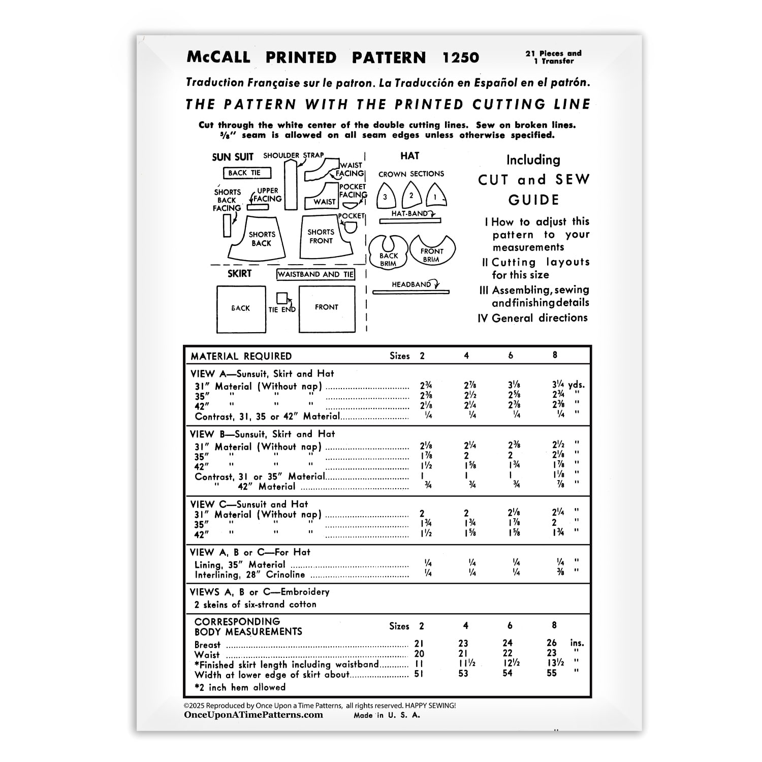 It comes in a new beautiful envelope with all pattern pieces. Many patterns include hand-embroidered details, if so the pattern comes with a stamping transfer to use as an embroidery guide, also includes the hand stitch embroidery instructions with how-to stitch illustrations. This is a fresh clean new beautifully reproduced pattern plus more sent to you.