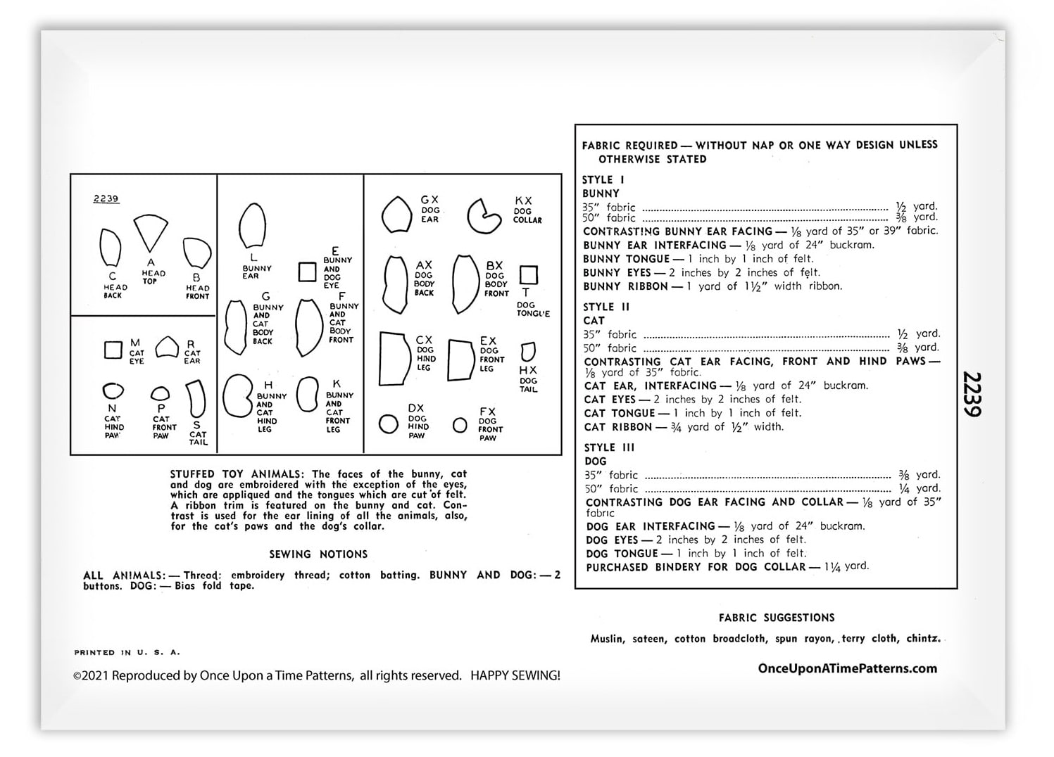 Simplicity 2239 is a charming vintage sewing pattern for creating three lovable stuffed animals: a dog, a cat, and a bunny rabbit. Each toy is fully detailed with step-by-step illustrated instructions, including sewing, stuffing, embroidery, and assembly guidance to help bring these classic characters to life.