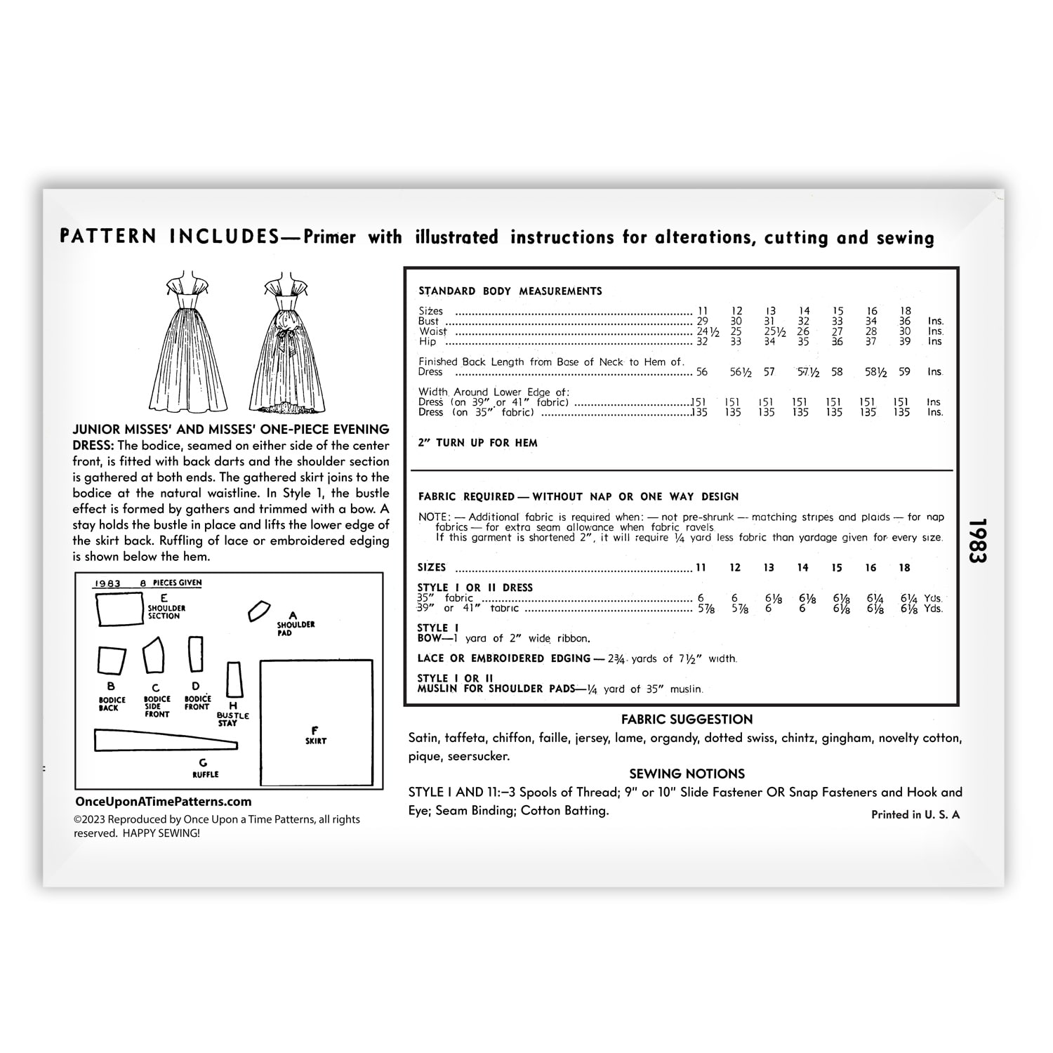 Simplicity 1983 is a vintage sewing pattern for a glamorous one-piece evening gown designed for juniors and misses. This elegant dress features a long, flowing skirt gathered at the natural waistline and joined to a fitted bodice, which is softly gathered at the shoulders and shaped with side and back darts. The oval neckline at the back closes with delicate button loops for a refined finish.