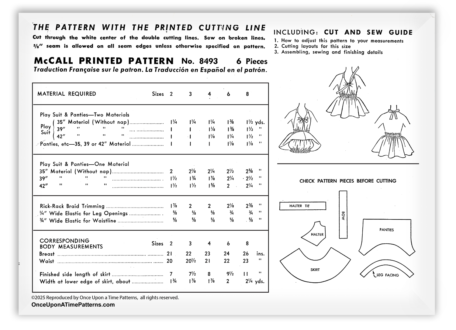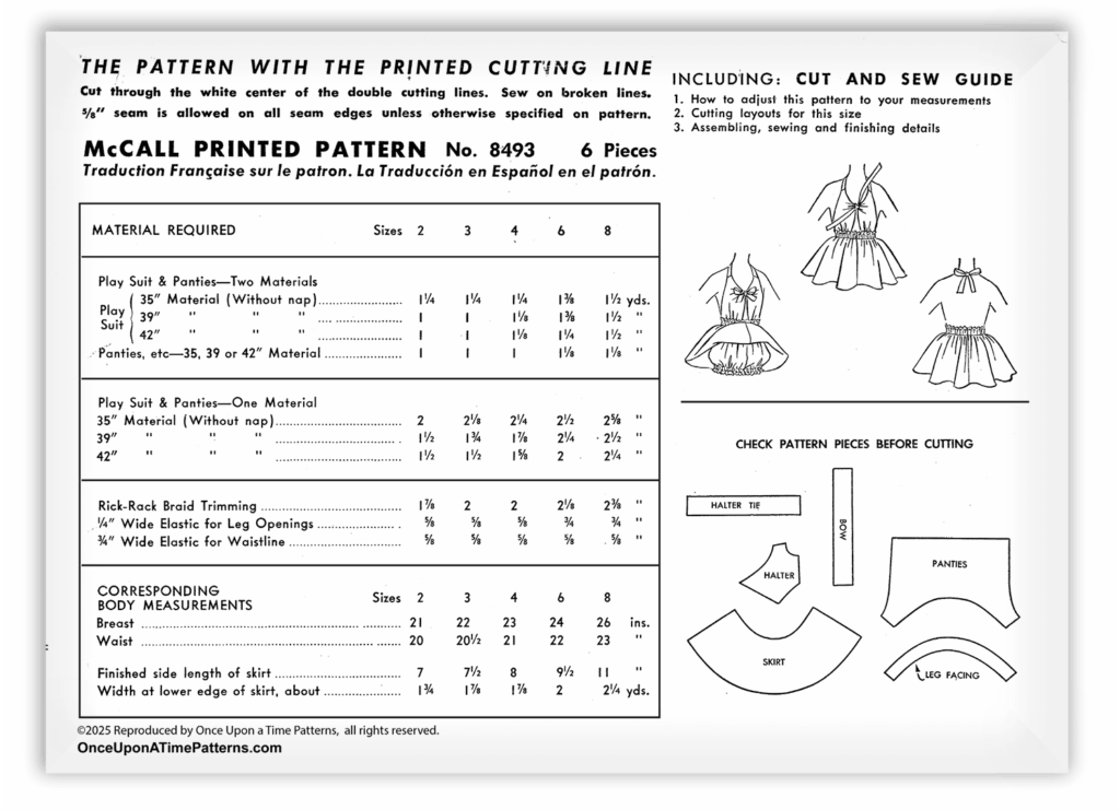 Create an adorable summer wardrobe essential with the McCall 8493 Girls Playsuit Sunsuit Halter Dress and Bloomer Panties Sewing Pattern. This charming design features a halter top that is attached to a gathered skirt, providing a comfortable fit. The halter neck ties offer an adjustable and customizable fit, making this the perfect choice for warm weather adventures.