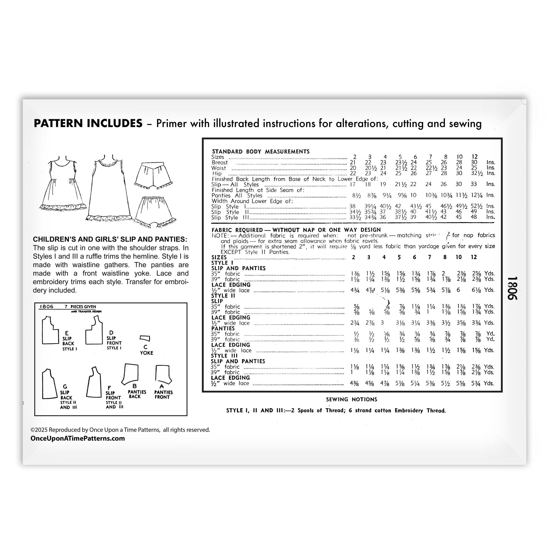 Simplicity 1806 is a lovely vintage sewing pattern for girls’ slip and panties, perfect for creating delicate heirloom undergarments. The slip is designed with charming details in each style variation. Styles I and III include a ruffle trimming the hemline, with Style I offering soft waistline gathers for a fuller silhouette.