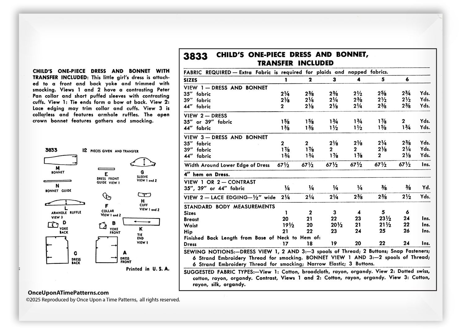 It comes in a new beautiful envelope with all pattern pieces. Many patterns include hand-embroidered details, if so the pattern comes with a stamping transfer to use as an embroidery guide, also includes the hand stitch embroidery instructions with how-to stitch illustrations. This is a fresh clean new beautifully reproduced pattern plus more sent to you.