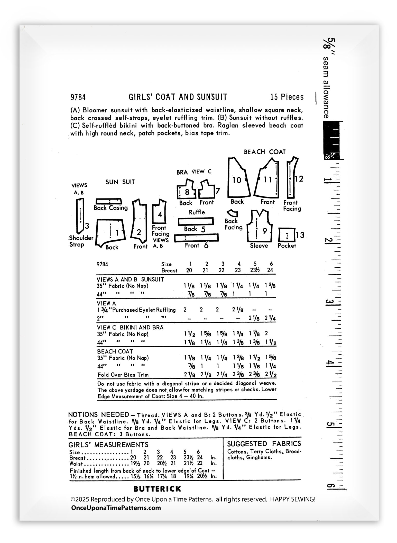 This Butterick 9784 vintage children’s beachwear sewing pattern offers a charming mix of playful summer styles designed for warm weather wear. The collection reflects classic mid-century seaside fashion with practical construction and decorative details that make each piece both functional and adorable.
