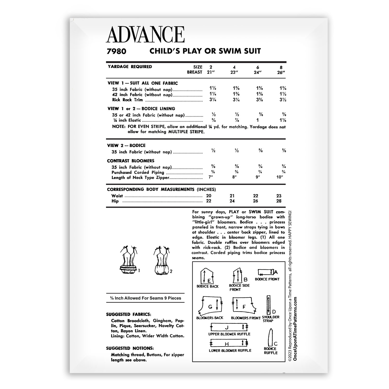 Advance 7980 is Perfect for sunny days, this sweet playsuit or swimsuit design features a charming combination of a long-torso, princess-paneled bodice with playful, elasticized bloomers.