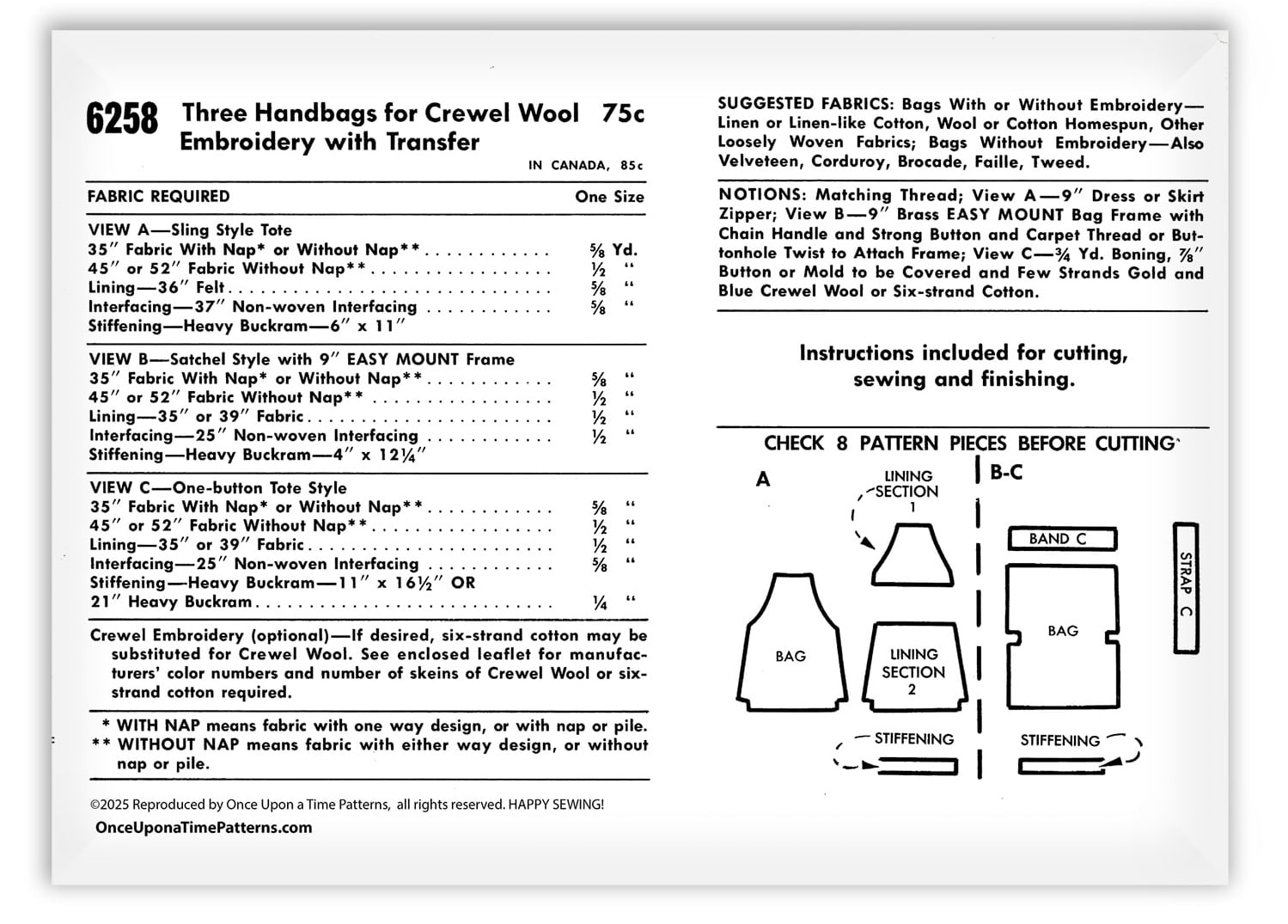 McCalls 6258 is a vintage sewing pattern featuring three classic handbag styles designed with optional crewel embroidery. The pattern includes transfers for tropical birds and floral motifs, allowing you to add decorative embroidery or keep the bags simple for a clean look. View A is a sling-style tote with a full lining, interfacing, and heavy buckram stiffening for structure. View B is a satchel-style handbag made with a 9-inch Easy Mount frame and includes lining, interfacing, and heavy buckram for durability and shape. View C is a one-button tote style, also fully lined and structured with interfacing and heavy buckram.