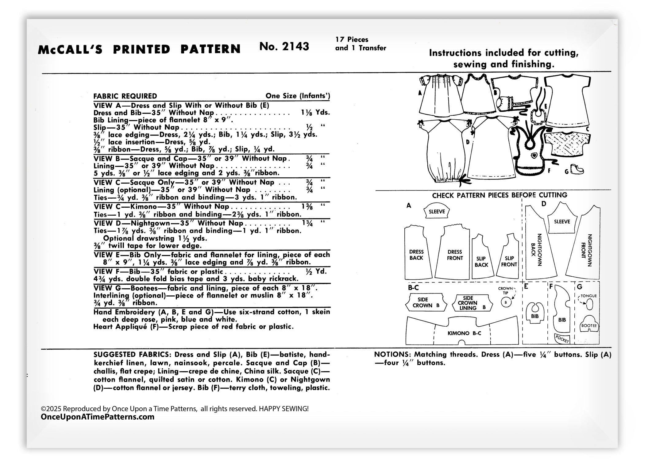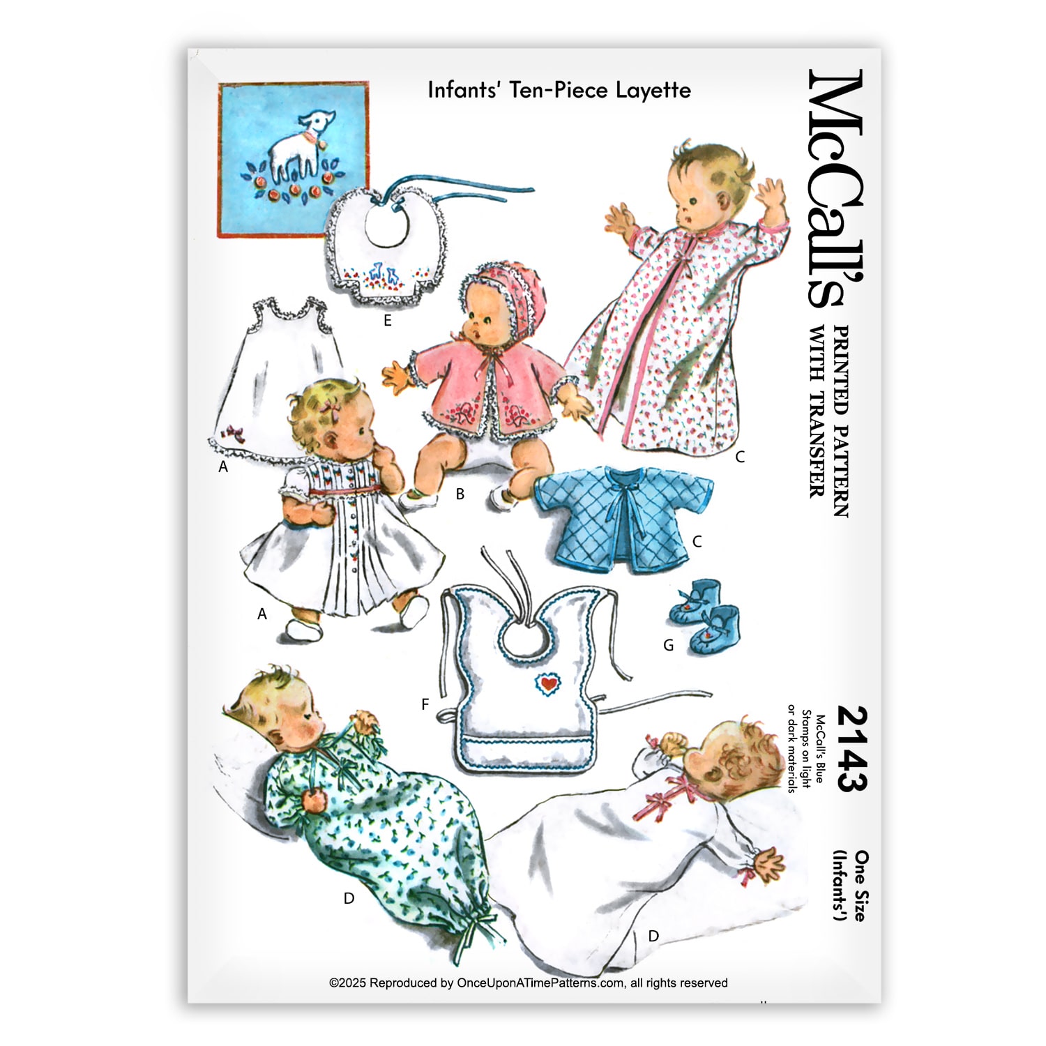 This vintage McCalls 2143 sewing pattern features a complete infant’s ten-piece layette, thoughtfully designed for newborns and young babies. The set includes essential garments and accessories for everyday wear, special occasions, and bedtime, all coordinated in a classic vintage baby style. The designs emphasize softness, comfort, and traditional detailing, making this pattern ideal for heirloom sewing, baby gifts, or vintage reproduction garments.