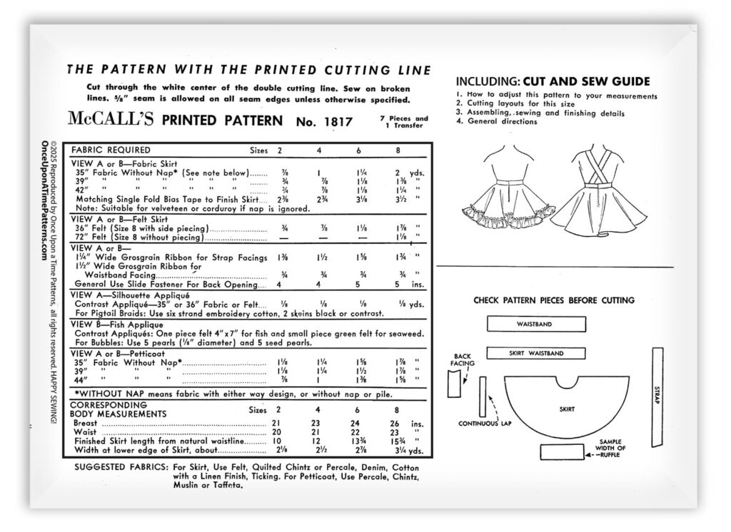 McCall’s 1817 Paper Doll or Fish Appliqué Child Circle Skirt with Suspenders and Petticoat Sewing Pattern. This adorable vintage child’s suspender skirt features a full circle and a buttoned-in petticoat for added fullness. The skirt can be made in fabric or felt and includes wide grosgrain ribbon strap facings for a polished finish.