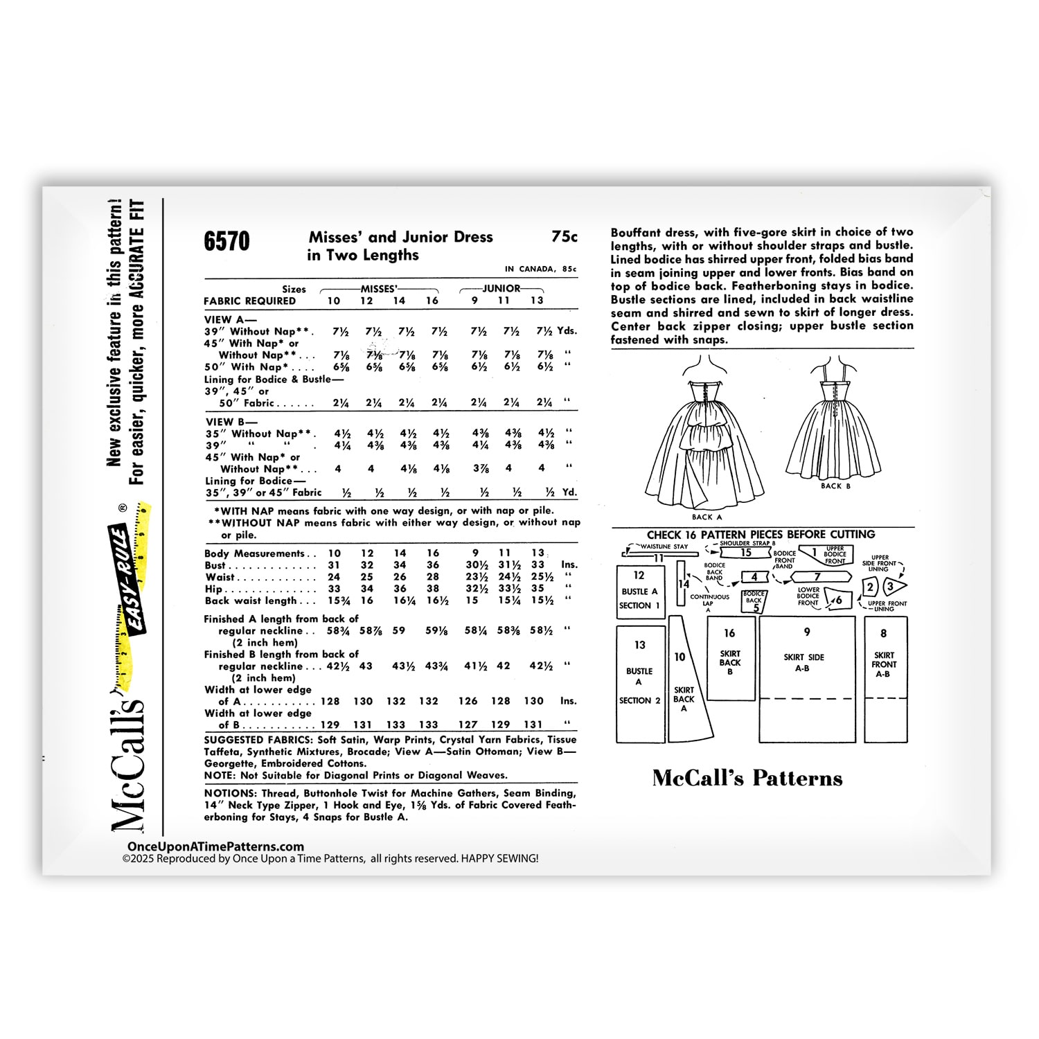 McCall’s 6570 is a stunning vintage evening ball gown pattern from the glamorous 1950s, designed for formal events and elegant soirées. This pattern creates a dramatic bouffant-style dress featuring a five-gore skirt offered in two lengths: full floor-length or shorter cocktail-style. The dress can be made with or without shoulder straps, giving sewists the option of a romantic strapless silhouette or added shoulder coverage.