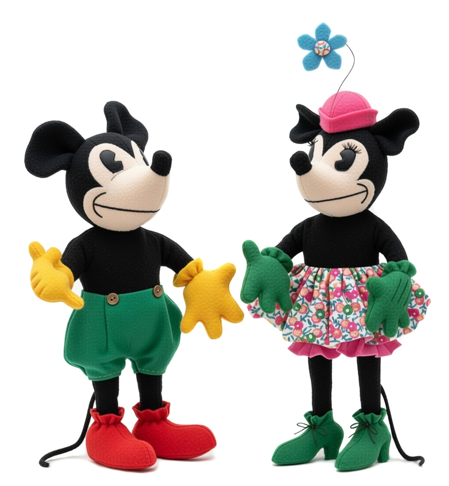 The wardrobe is an integral part of the design and is fully included. Mickey’s trousers and cap, Minnie’s panties, skirt, hat, gloves, and shoes are all constructed specifically to fit the dolls’ proportions. Minnie’s shoes include optional heels for larger sizes, while smaller versions match Mickey’s flat shoes. The pattern also includes directions for accessories such as Minnie’s flower with wired stem, gloves that fit over the arm wire loops, and finishing details that give the dolls a polished, professional appearance.
