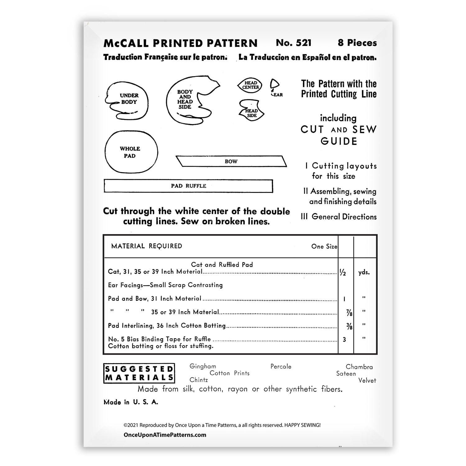 McCall 521 is a charming vintage sewing pattern to create a stuffed sleeping cat—the perfect nostalgic bed decoration! Measuring approximately 11½ inches long, the cat lies peacefully on a quilted, ruffled pad, making it ideal as a sweet accent for a child’s room or guest bed.