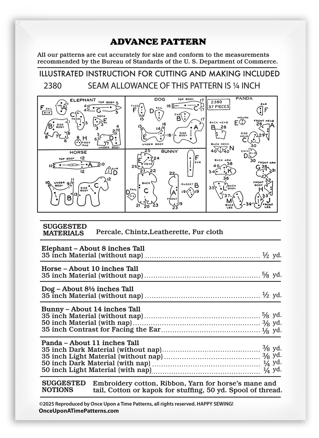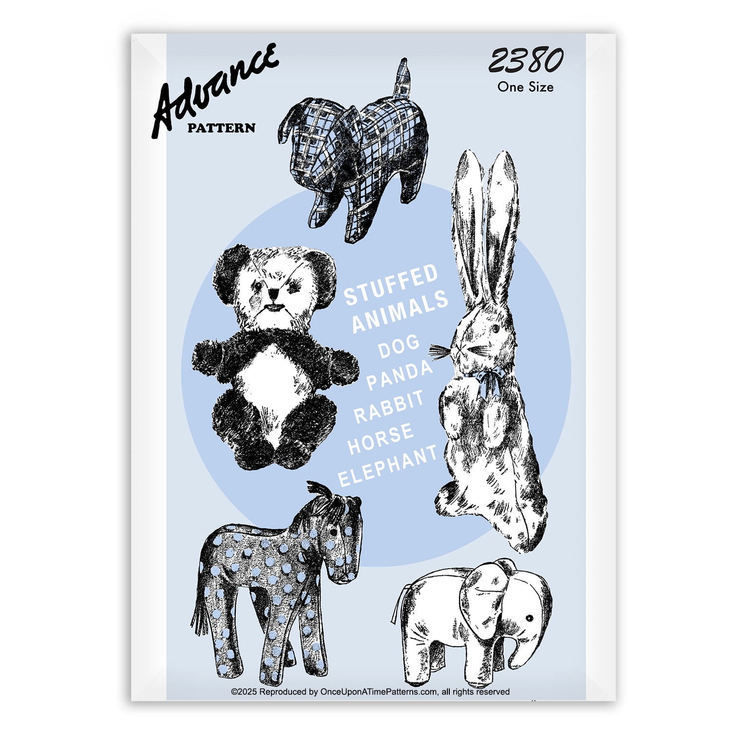 Advance 2380 Stuffed Animals Sewing Pattern includes five charming soft toys: a dog, panda, rabbit, horse, and elephant. Each animal features classic vintage styling and is designed to be stuffed with cotton or kapok for a firm, huggable finish. Suggested materials include percale, chintz, leatherette, and fur cloth, allowing each toy to be made with smooth or textured fabrics depending on the desired look.