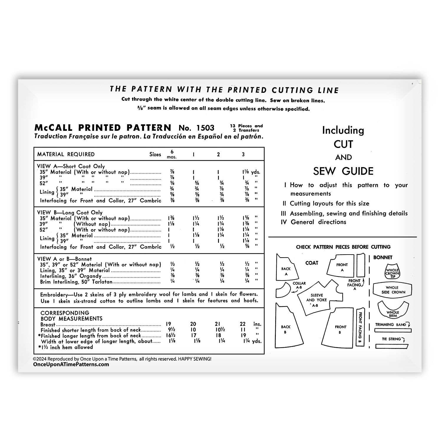 Sew a classic and charming toddler outfit with the McCall 1503 Sewing Pattern, featuring an elegant coat and matching bonnet. This vintage-style pattern is designed for toddlers and showcases beautifully embroidered flowers and lambs, adding a sweet and timeless touch to your handmade creation.