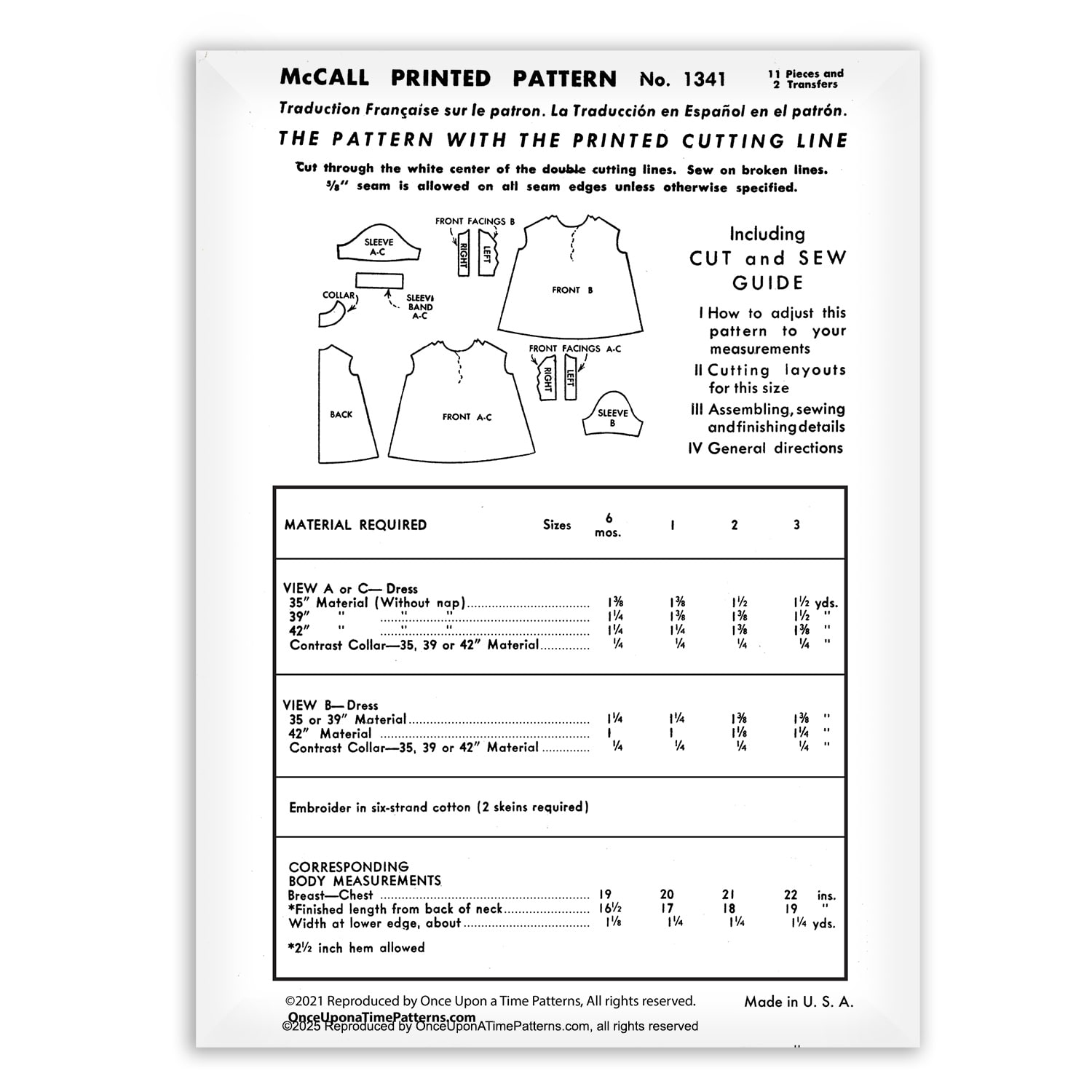 McCall 1341 is a charming vintage sewing pattern for a toddler’s dress, designed for both comfort and classic style. The dress features two deep pleats for ease of movement and a unique zigzag front opening outlined with delicate baby trim. Embroidered flowers accent the Peter Pan collar, sleeve bands, and zigzag front edge, adding a sweet handcrafted touch.