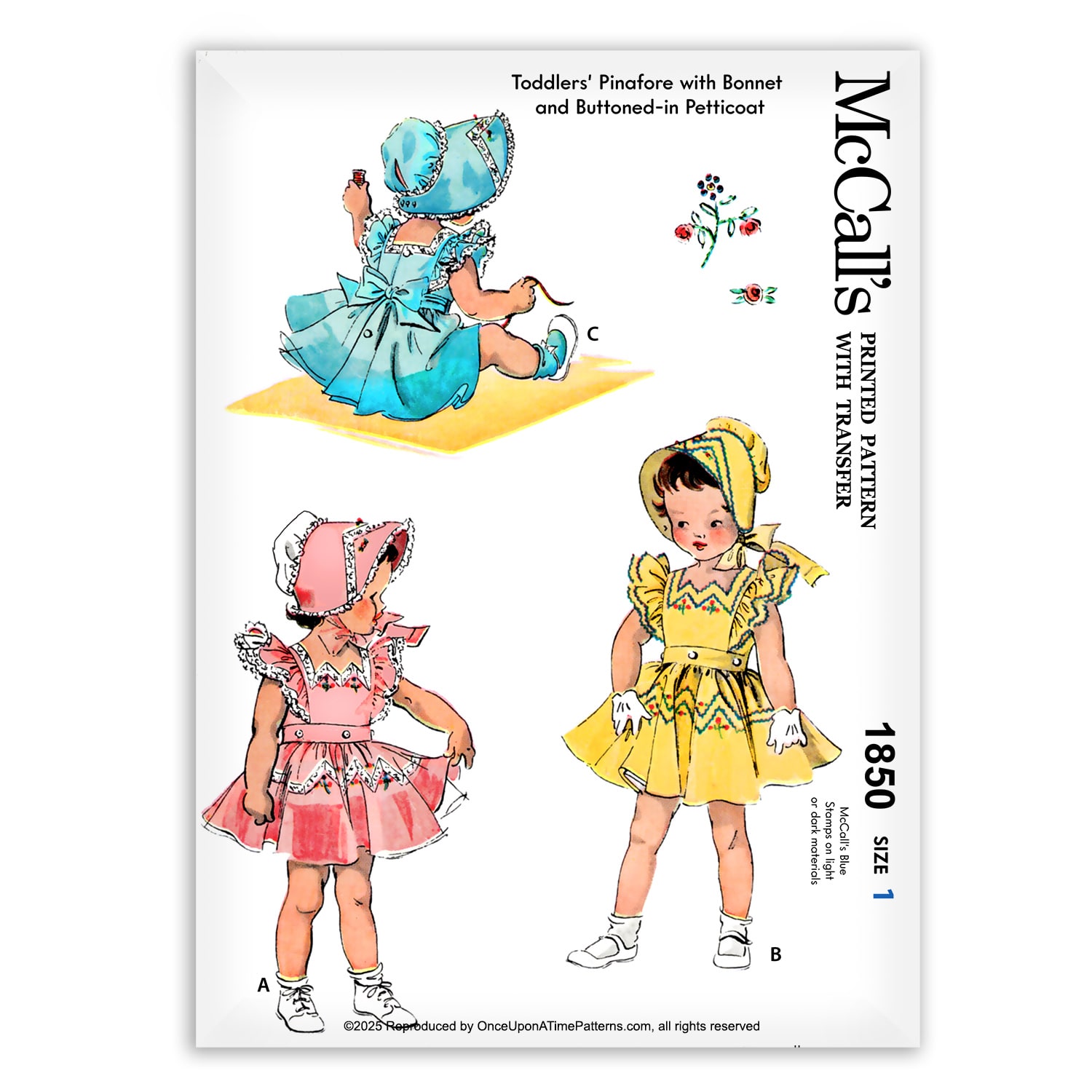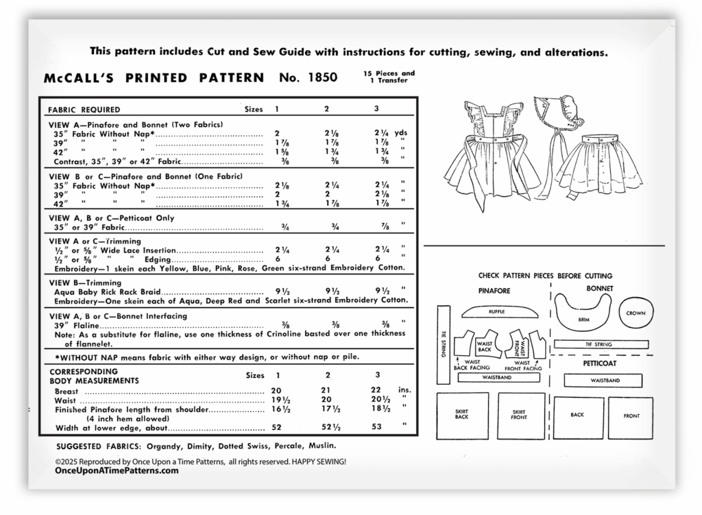 The McCalls 1850 is a timeless treasure for little ones, this pattern creates an enchanting toddler pinafore with a matching bonnet and a button-in petticoat.