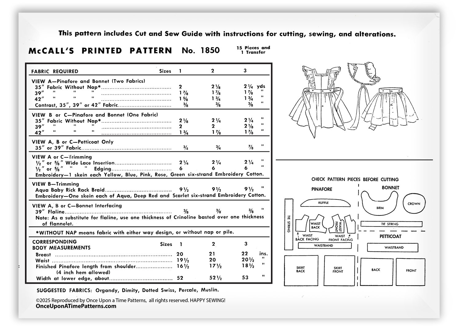 View A features a pinafore and bonnet made with two coordinating fabrics, trimmed with wide lace insertion, delicate edging, and embroidered flowers. Views B and C offer the pinafore and bonnet in a single fabric, while all three views include the option for the petticoat alone.