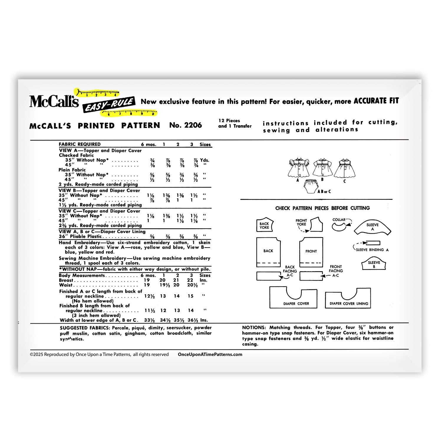 McCall’s 2206 is an adorable vintage sewing pattern designed for toddlers, featuring a sweet empire-waist topper and practical diaper cover—perfect for warm-weather play or special outings.