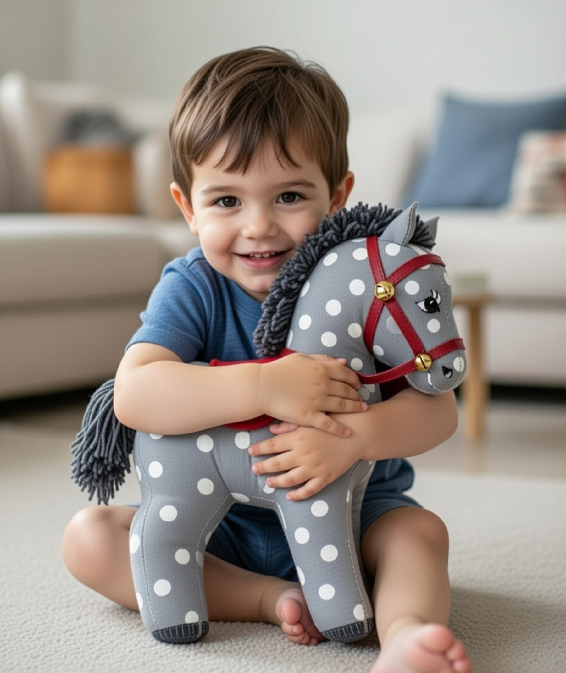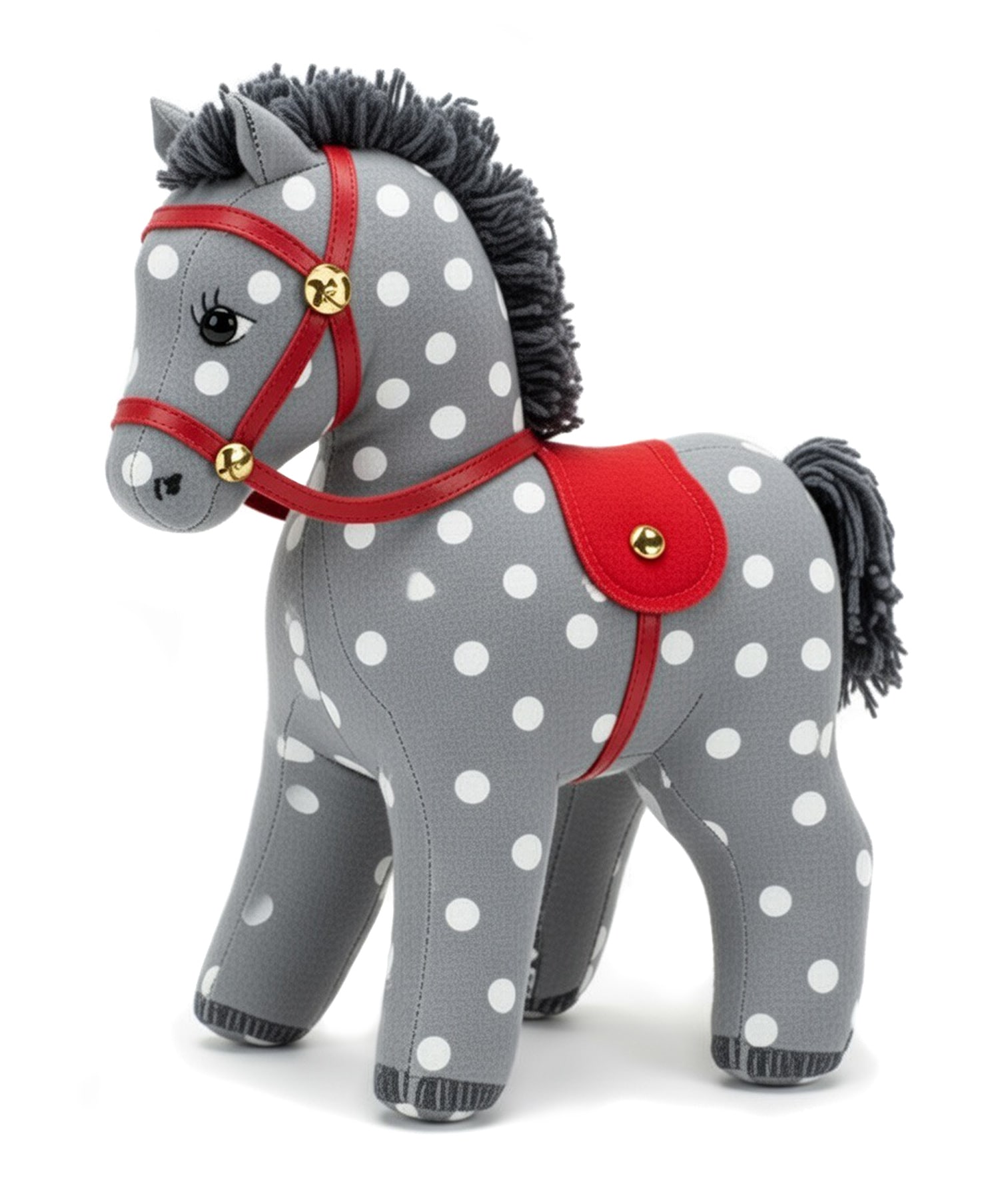 Thoughtful details elevate this toy beyond a simple stuffed animal. The pony features a grosgrain ribbon harness and reins, accented with buttons or optional embroidered flowers, as well as a contrasting fabric saddle trimmed with ribbon. The mane and tail are made from rug yarn, with clear crochet and finishing instructions provided to achieve a full, textured look.