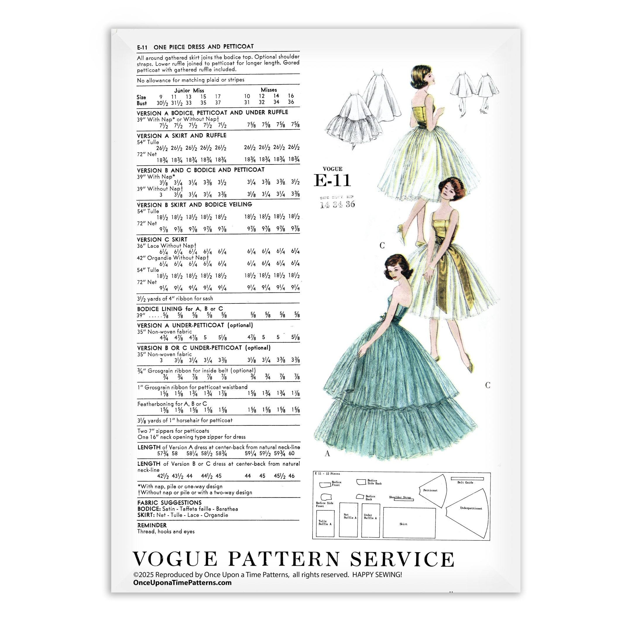 Create a showstopping evening gown with Vogue E-11, a vintage sewing pattern for a strapless dress and petticoat. The bodice joins to a full, gathered skirt with optional shoulder straps and veiling. A lower ruffle is attached to the petticoat for added length and drama. Multiple views offer styling flexibility, including a gored petticoat, optional under-petticoat, and net overlays. The bodice is lined and supported with feather boning and grosgrain ribbon as a optional belt. Ideal fabrics include satin, taffeta, faille, barathea for the bodice, and tulle, lace, or organdy for the skirt. Perfect for junior miss and misses sizes, this pattern gives you all the structure and elegance of a classic couture evening look.